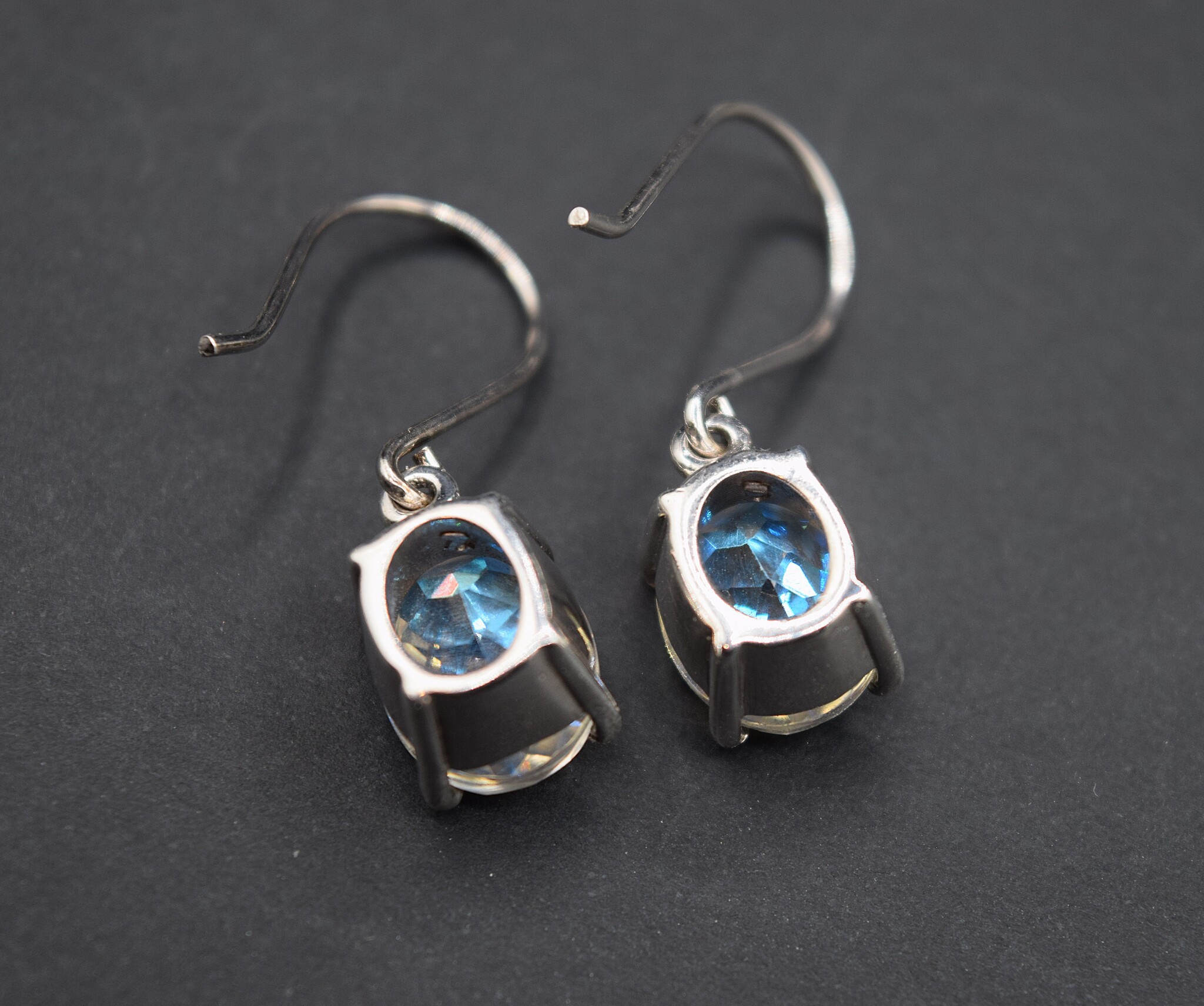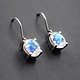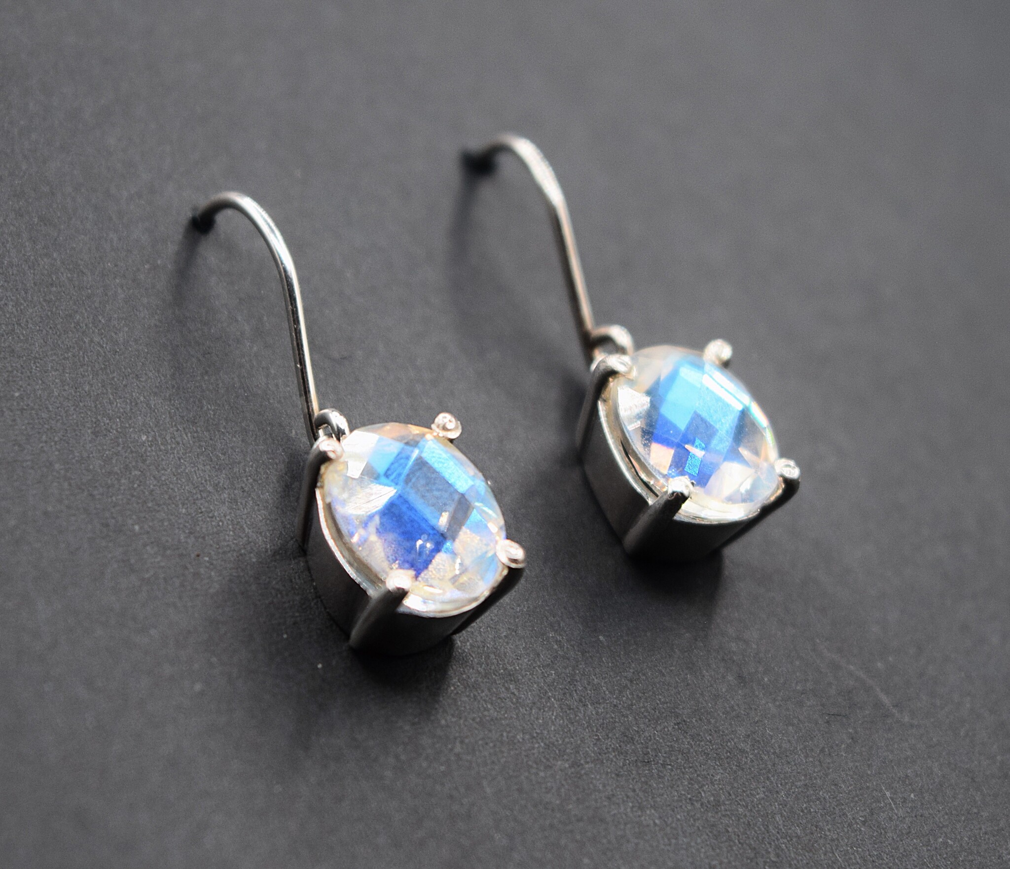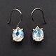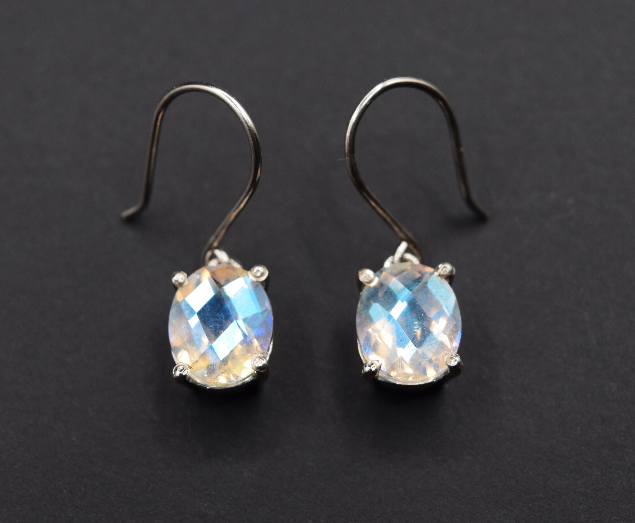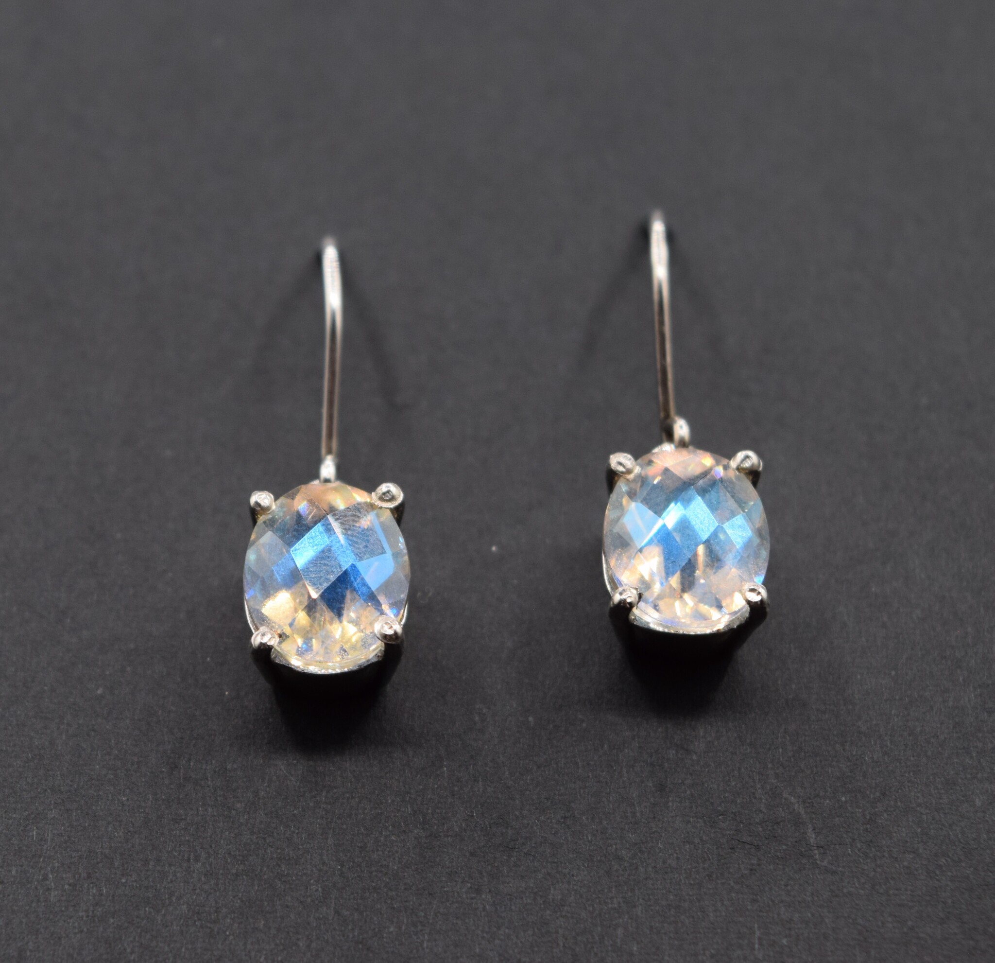 Clear Quartz 11x9mm oval with a permanent platinum plate on top gives it an iridescent shimmer, that is further enhanced by its large diamond-shaped facets. Prong set in 925 Sterling silver, it also has thick silver ear wires.