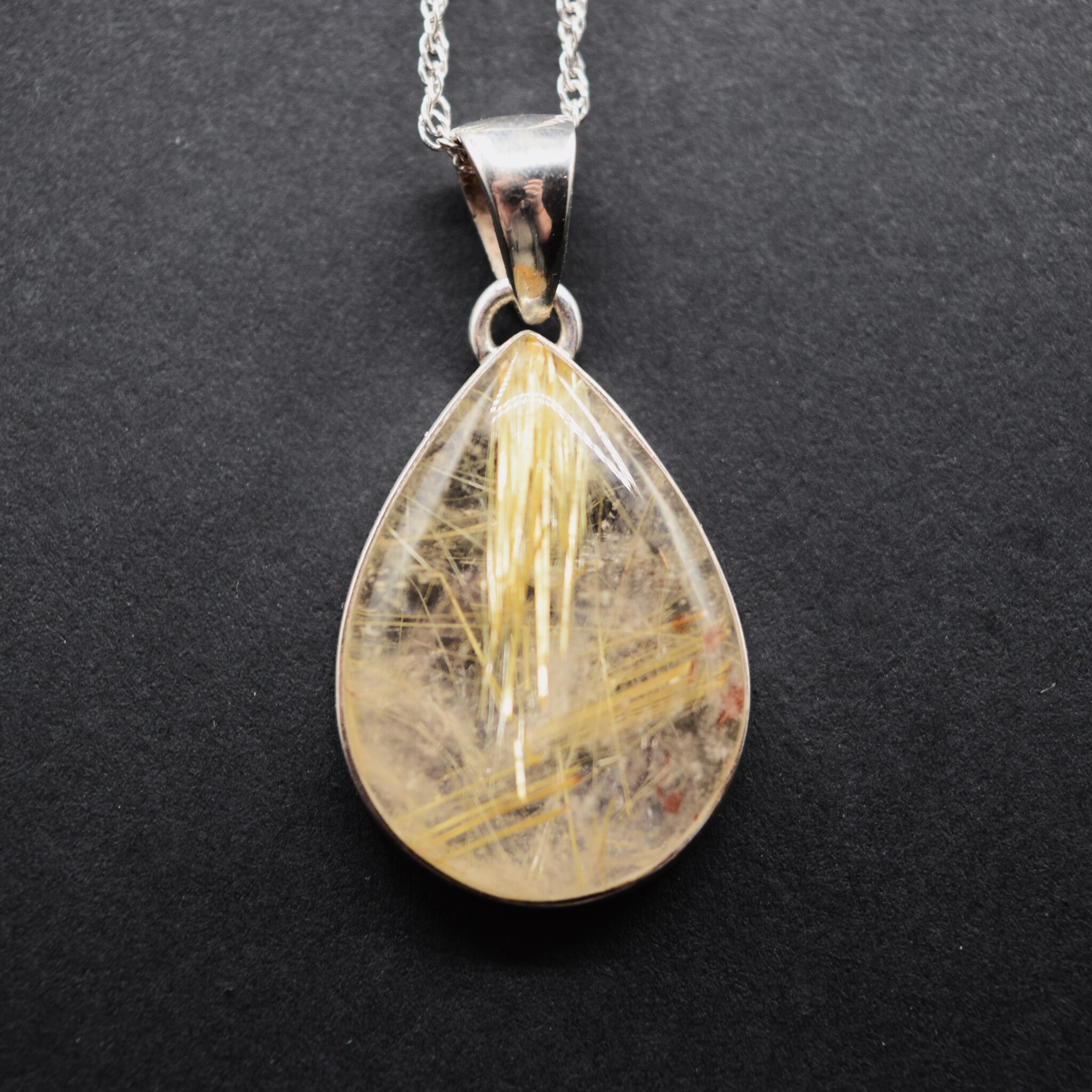 Rutilated Quartz Teardrop Cabochon 17x25mm set in a Sterling Silver low bezel. *Does NOT come with chain*