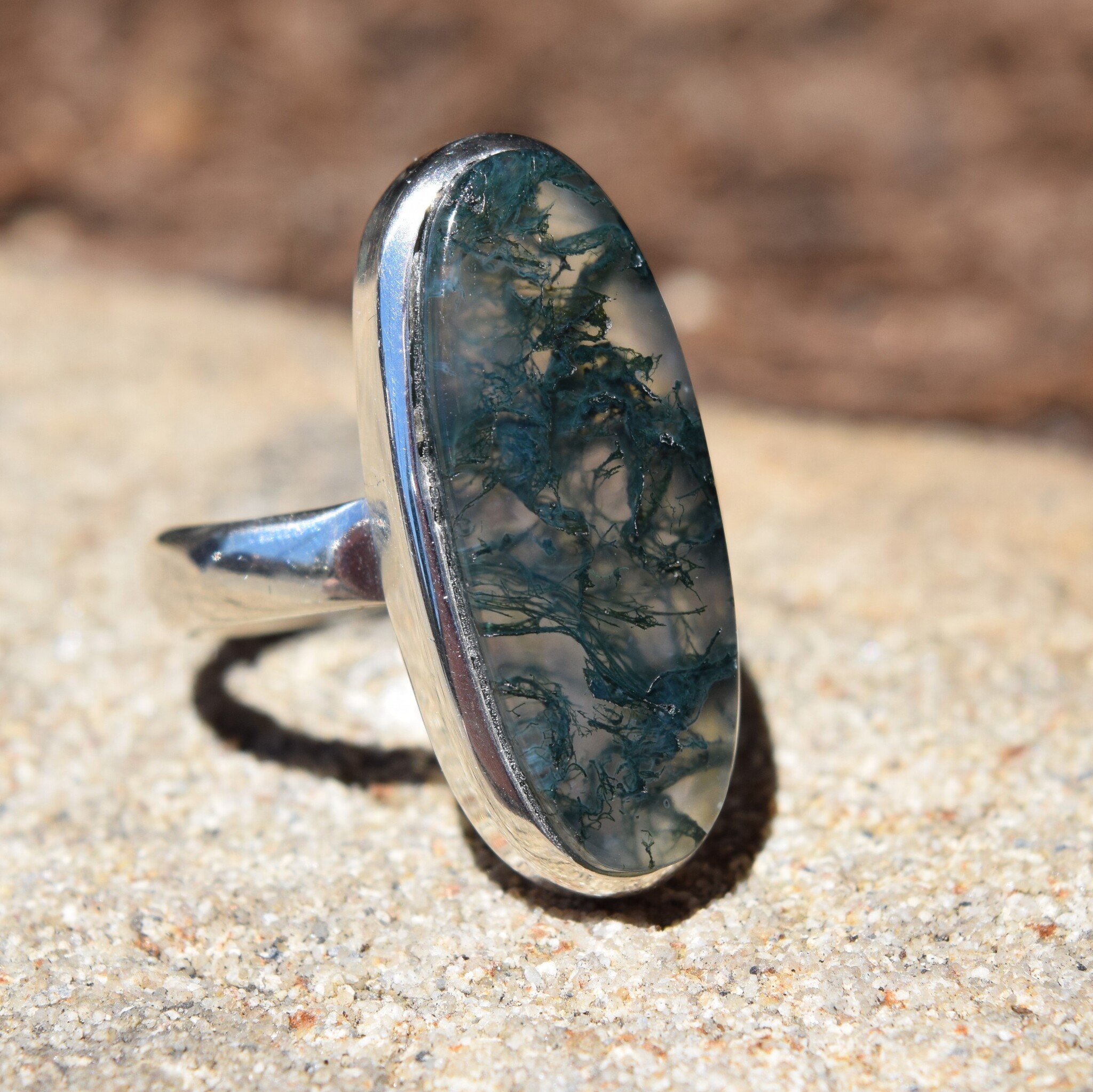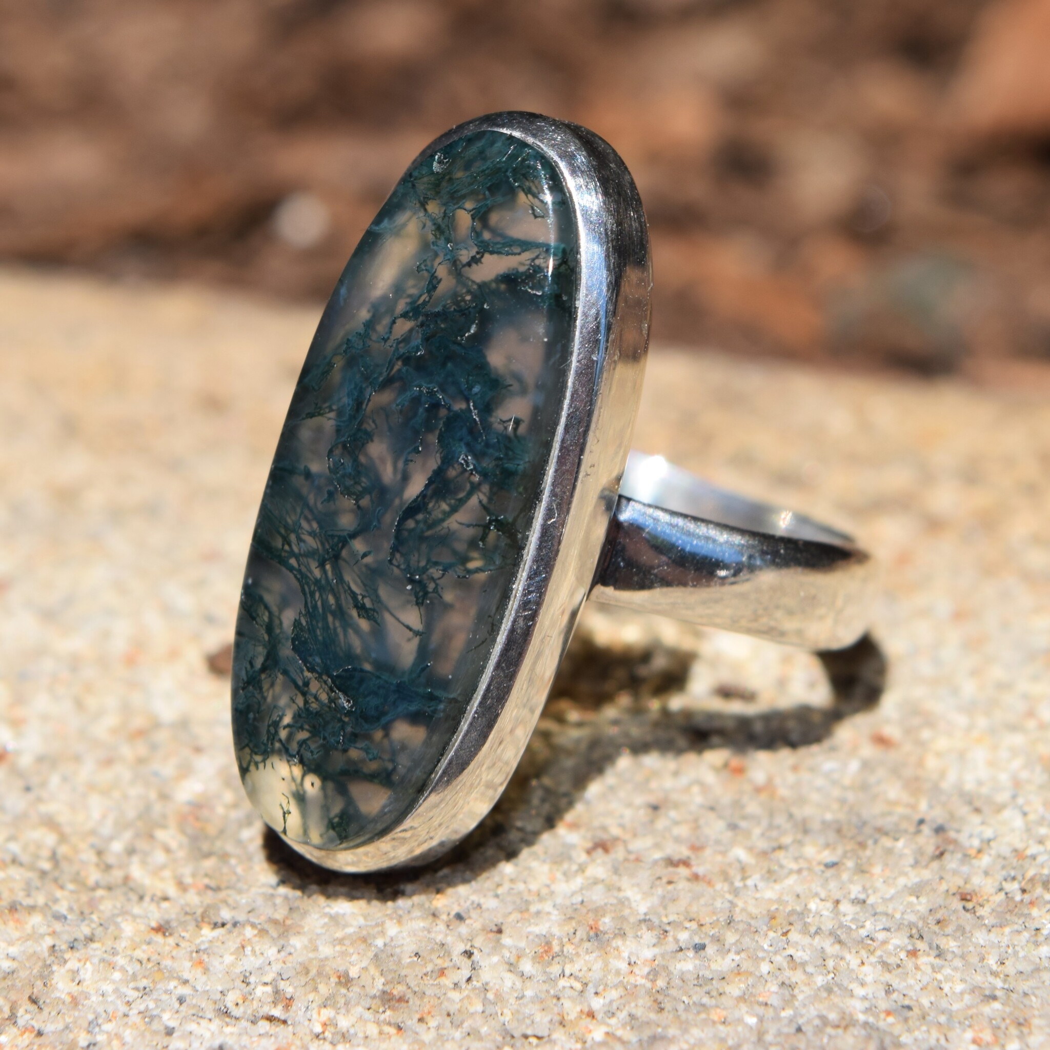 Oval Moss Agate 26mm cabochon, bezel set in Sterling Silver. Ring, Size 8.